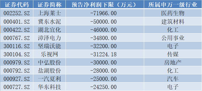 从净利润亏损绝对金额的角度来看,预告净利润下限较大前十家公司中,上海莱士(002252.SZ)亏损金额达到7.2亿元,位居榜首;冀东水泥(000401.SZ)以及湖北宜化(000422.SZ)紧随其后,亏损金额分别达到了5亿元和4.6亿元,另外漳泽电力(000767.SZ)等7家公司的净利润亏损也至少超过了2.4亿元,具体情况如下表所示: