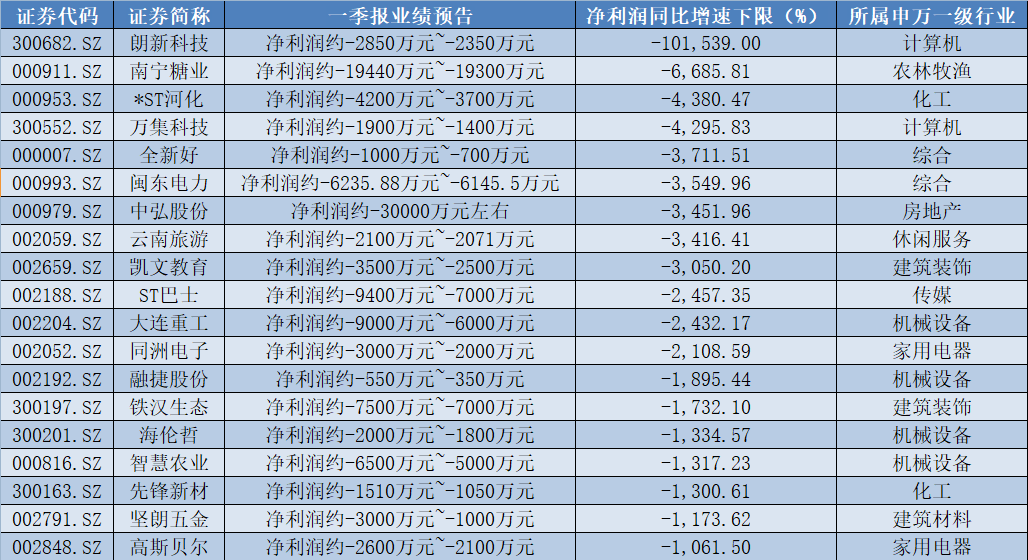 从净利润同比下滑幅度来看,朗新科技(300682.SZ)同比下滑幅度下限超过1000倍,排在下滑榜单的第一位,南宁糖业(000911.SZ)和*ST河化(000953.SZ)紧随其后,同比下滑幅度分别达到了6685.81%和4380.47%。