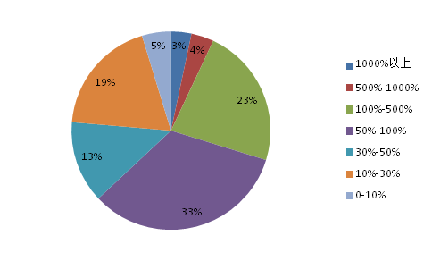 其中,同比下滑幅度主要集中于50%-100%区间,共有190家公司,占比达到33.27%;下滑幅度介于100%-500%区间的有130家,占比为22.77%;介于10%-30%区间的有108家,占比为18.91%;介于30%-50%以及0-10%区间的各有76家和27家,占比分别达到13.31%和4.73%;值得一提的是,同比下滑幅度超过1000%以及介于500%-1000%的分别有19家和21家公司。