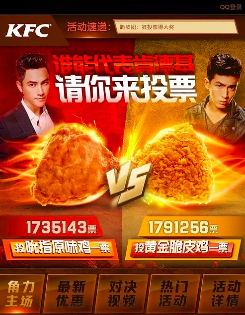 在中国,肯德基也曾在2014年新年档发起过”谁能代表肯德基“的投票,把有一票忠实消费者的菜单老牌吮指原味鸡、与新品黄金脆皮鸡放在一起比较,还请来陈坤与柯震东代言二者。