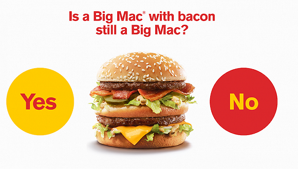 为了让消费者注意到这个变化,加拿大麦当劳发起了加了培根的巨无霸还是不是巨无霸的投票,呼吁消费者在官网和社媒发表自己的意见。这场争论到最后简直变成了一个哲学问题——有人拿“蘸了番茄酱的薯条还是不是薯条”类比,也有人表示“这世界上只要有了培根,还有什么是解决不了的呢?”一度讨论相当热烈。