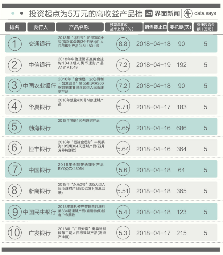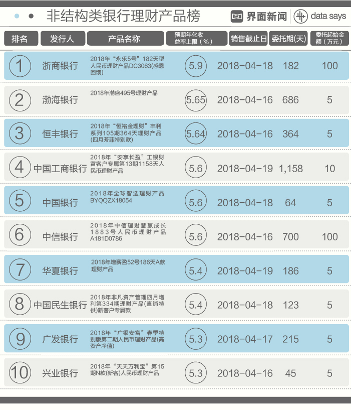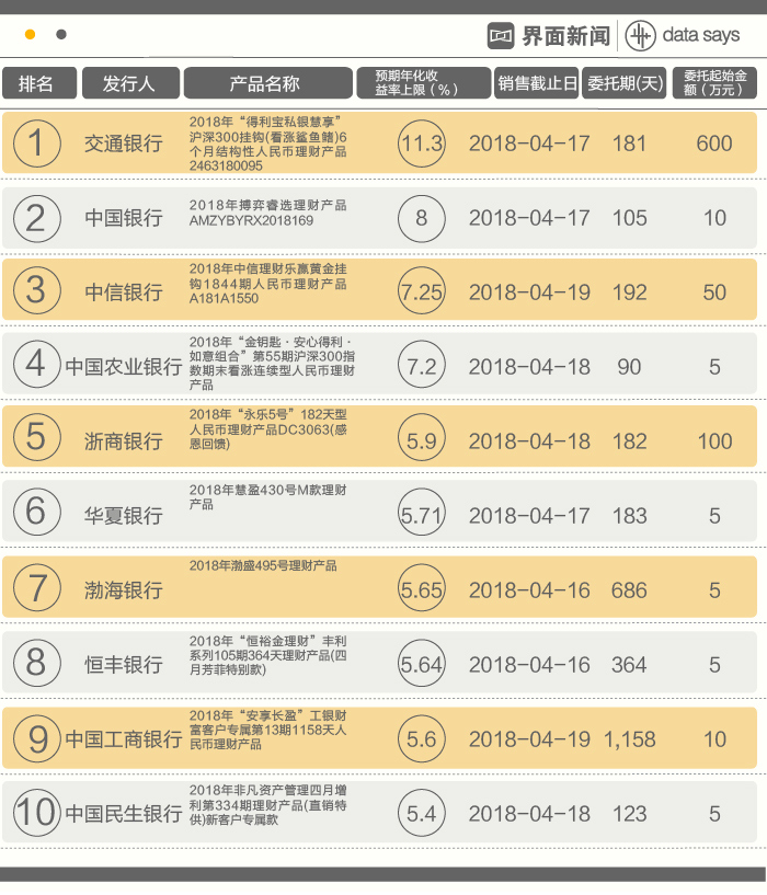 来看看本周有哪些可以挑选的银行理财产品,本周,18家国有商业银行和股份制商业银行全国范围发售针对个人的人民币理财产品310只,界面新闻从每家筛选了收益率最高、最值得关注的理财产品,共10只。