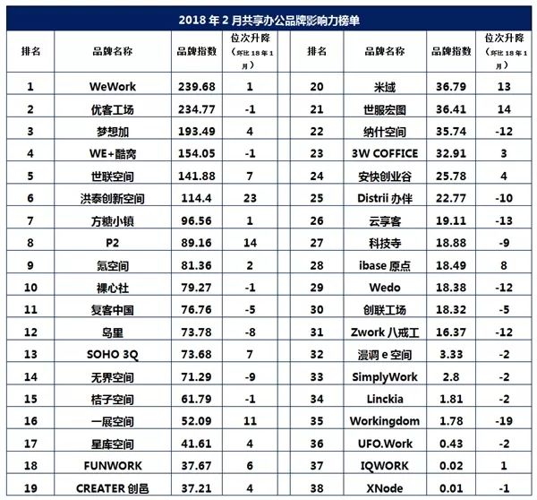 目前,根据迈点研究院(MTA)《2018年2月共享办公品牌分析报告》,2月,共享办公品牌风云榜TOP10依次是WeWork、优客工场、梦想加、WE+酷窝、世联空间、洪泰创新空间、方糖小镇、P2、氪空间以及裸心社。