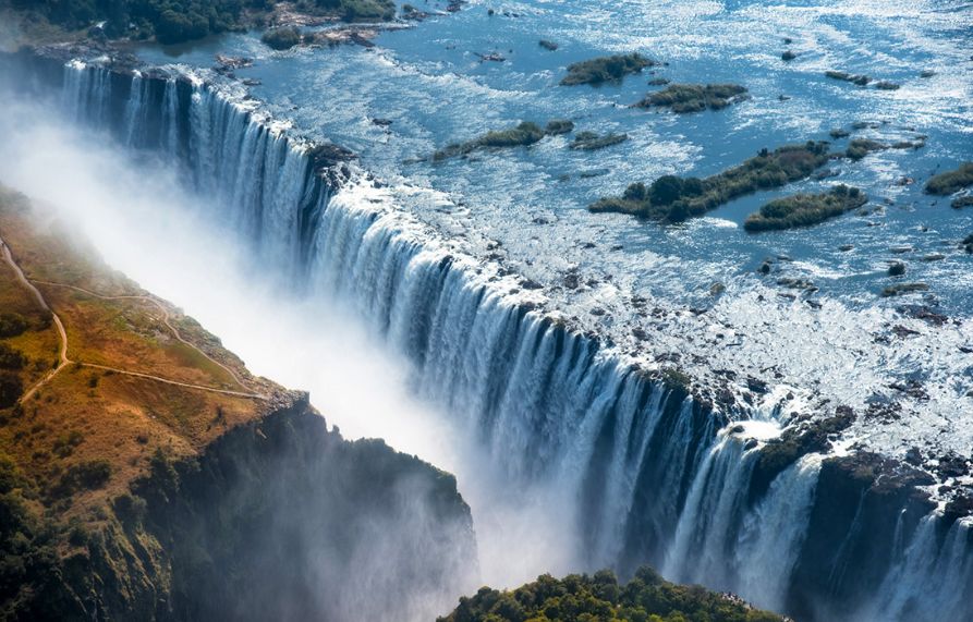 在这里,舒缓悠长的赞比西河,突然从高达150英尺的陡崖上跌入深邃峡谷,浪花溅起300多米,就算是在几十公里外也可以清晰看到。