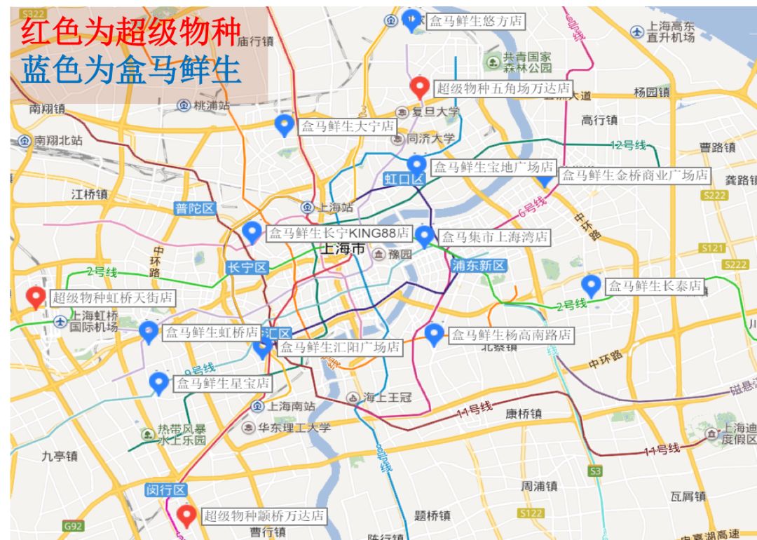 我们从盒马鲜生和超级物种的门店分布图可以看出,盒马覆盖社区人群的餐桌经济,它将整个生鲜、美食、餐桌经济的概念打通了,还实现从食材源头到餐桌的一站式交付。而超级物种,主要分布在城市的外围,是围绕着流动人群的商圈经济。
