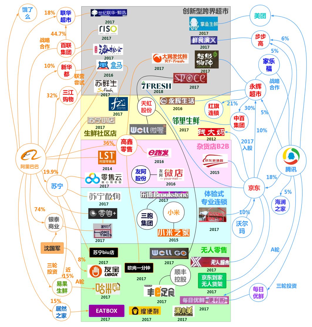 说完宏观,从中观层面我有三条主线,一个是纵向看,来说一说巨头在新零售的布局情况;二是横向看,两大巨头在多领域是如何全线竞争的,最后再提炼一下它们思路上的差异。