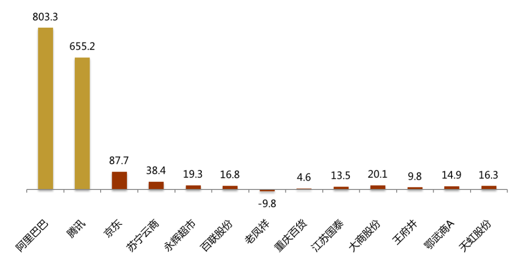 互联网巨头和 A 股收入前十零售企业经营性净现金流(亿元,去年年报)