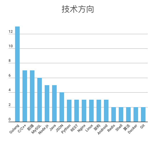 不同区块链团队对技术栈的要求基本覆盖了前后端、数据、算法和架构等类型。我们统计了这些招聘需求中的首选技术方向,发现 Go 语言的出现频率最高,C/C++、前端和 MySQL 也榜上有名。