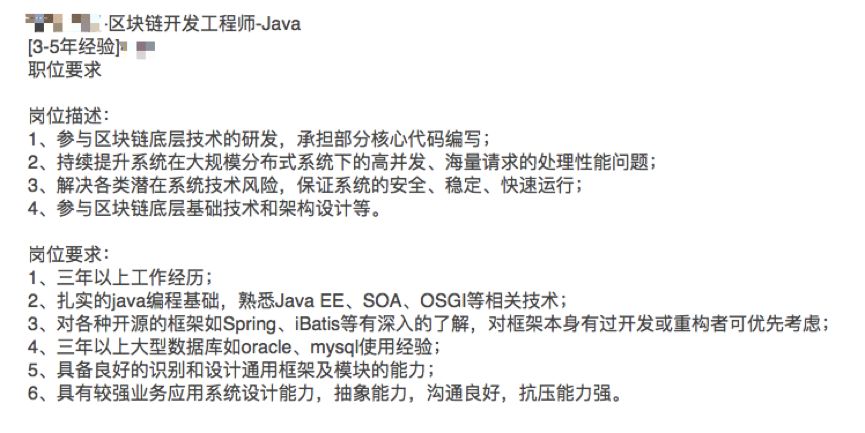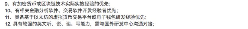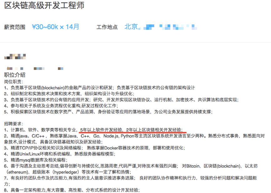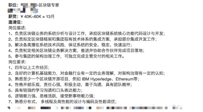 另外,区块链企业也重视来自传统金融的转型人才。因为区块链要面对的核心问题仍然是传统金融中心化环境中的一致性、原子性等典型问题,只不过是采用分布式的方法。因此,如果你手头有金融行业底层结算项目经验,或平安、陆金所等知名互联网金融团队的工作经历,应聘区块链岗位效果最佳;若有点对点项目经验,比如迅雷、土豆和 PPS 等工作背景也能大大加分。