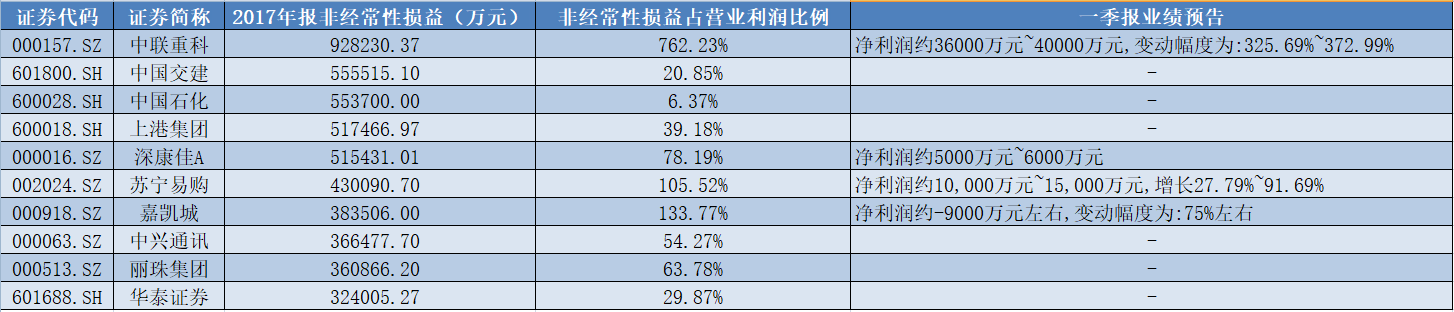 截至4月16日收盘,共有1699家上市公司披露了2017年年报。在年报数据中,“非经常性损益”越来越受到投资者关注,即上市公司通过非主营业务而取得的收益或亏损,如投资收益、出售房屋、土地或其他资产等。这是因为扣除这些不可持续的收益或损失,才能还原上市公司经营业绩的真实面目,从而有助于投资者进行投资决策。