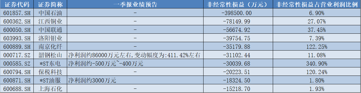 其中,中国石油(601857.SH)无疑是那个最不走运的,公司全年非经常性损失达到39.85亿元,江西铜业(600362.SH)以及中国联通(600050.SH)紧随其后,金额分别达到了7.81亿元和5.67亿元,非经常性损失前十名公司具体情况如下表所示: