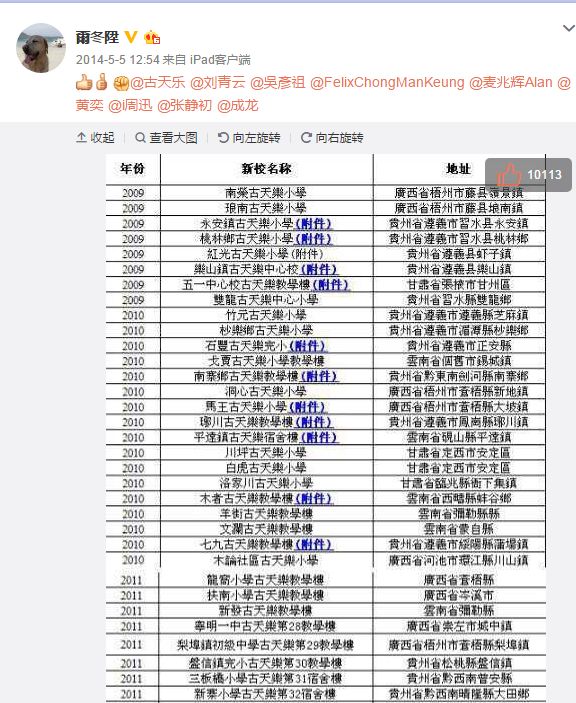 尔冬升在微博上贴出一张名单,并@了当时《窃听风云》剧组的所有成员,名单上则是记录了古天乐从2009年以来在广西、贵州、云南等地出资千万建造的61所小学。