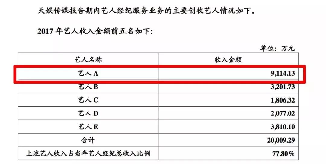 快乐购此前发布的“关于上海天娱传媒有限公司业绩真实性专项核查报告”显示,天娱传媒2017年的艺人经纪业务收入为2.57亿,其中单个艺人贡献创收9000多万,很明显这个给天娱带来9000多万的艺人一定是华晨宇无疑。在并未涉足影视的情况下,2017年华晨宇通过音乐、综艺与商务代言这几块为公司赚了9000多万,占艺人经纪营收2.57亿的35%。
