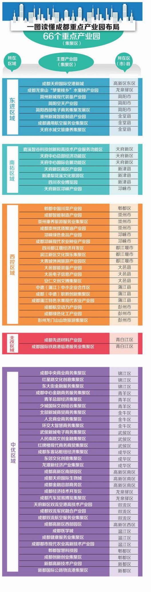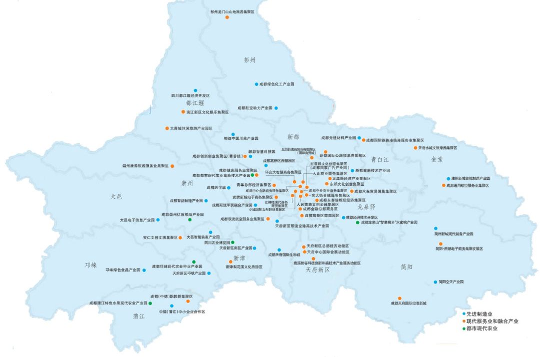 全成都市统筹布局建设66个主导产业明确、专业分工合理的产业功能区,全面提升城市能级。这66个产业功能区地理分布见下图。