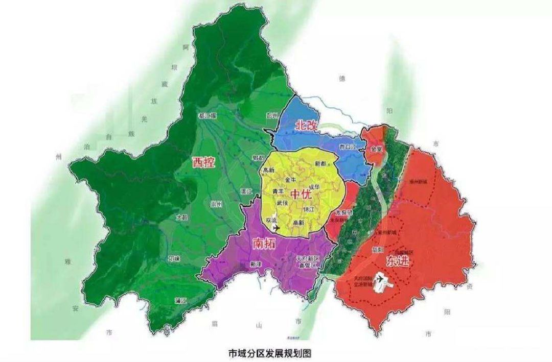 “中优”区域,即现有中心城区五城区,涉及龙泉驿区、郫都区、新都区、双流区、温江区、天府新区及高新区部分区域。重点发展生产性服务业、高端生活性服务业,重点支持金融商务、总部办公、国际交往、数字经济、文化创意和都市休闲旅游等产业,培育一批现代服务业集聚区、专业楼宇和特色楼宇,促进承载天府文化的特色商贸、文化、教育等生活性服务业精细化、品质化发展。
