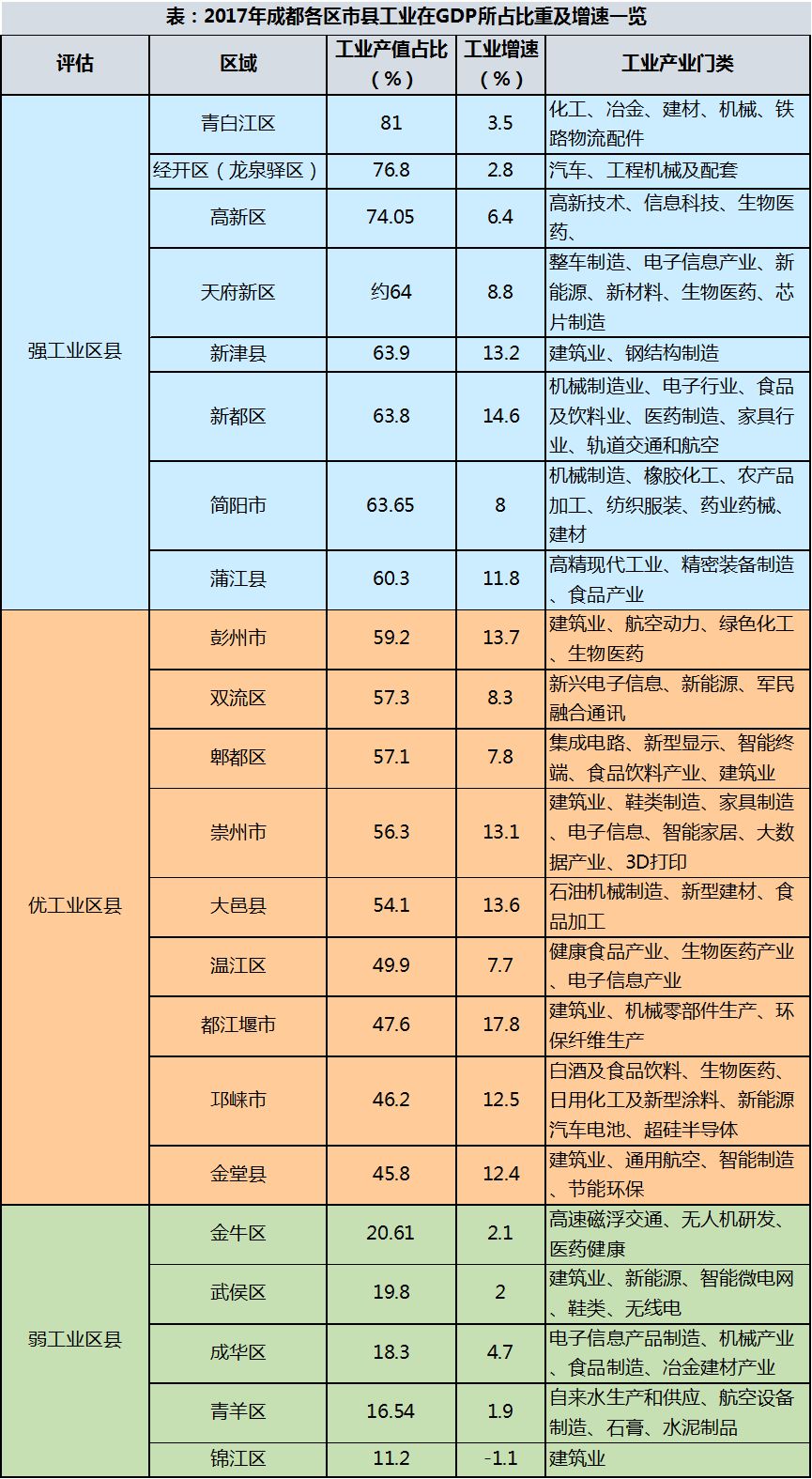下面是一张很有意思的统计表格,我们分析了2017年成都22个区市县的工业产值在其总GDP所占份额以及增速。从数据角度看,它可能会颠覆人们对成都某些区市县的固有印象。