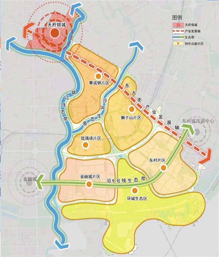 空间布局上,锦江区将构建“一核一轴三带六片”空间格局。即天府锦城核心区、东大街产业发展轴,锦江、沙河、9号线3条生态带;以及“攀成钢、琉璃场、狮子山、金融城、东村、环城生态区等6个特色功能片区。