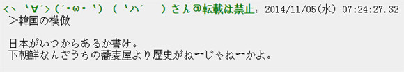 “模仿韩国……怎么不写写日本是从什么时候建国的?南韩的历史不是比我家荞麦面店的历史还短么。”