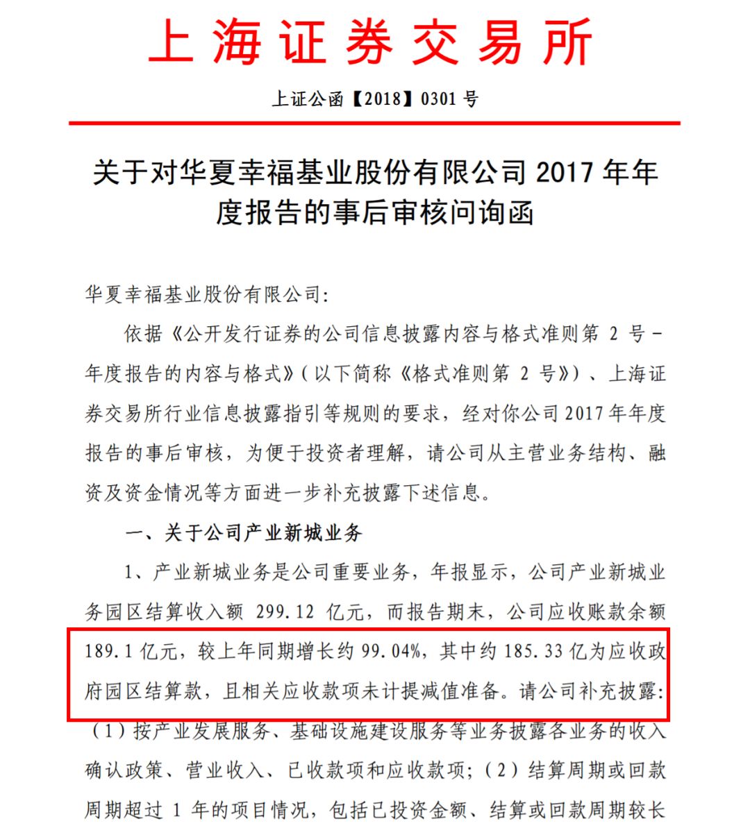 185亿应收款零计提 华夏幸福遭交易所问询