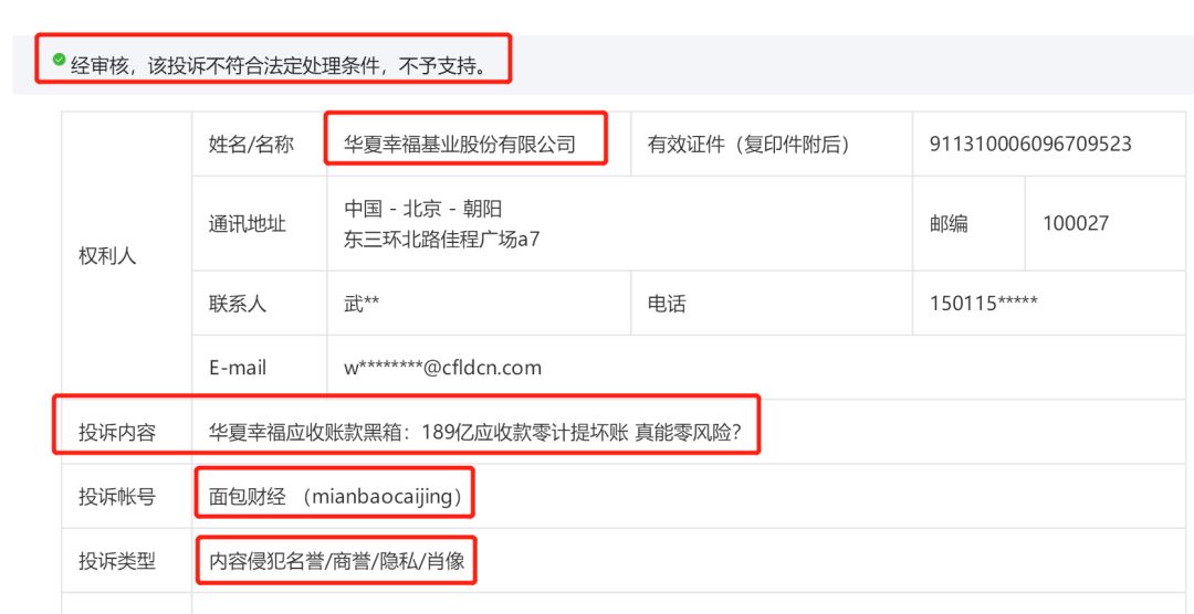 最终,微信认定华夏幸福的投诉不成立,对其投诉要求不予支持。