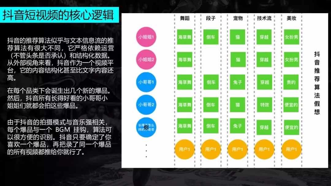 抖音上有舞蹈、段子、宠物等品类,各个品类下每天都会诞生几个新的爆品,抖音的KOL会对爆品进行模仿,吸引更多的用户观看模仿。抖音一个很强的特点是每个爆品会跟BGM去挂钩,这种形式下算法很容易识别内容。