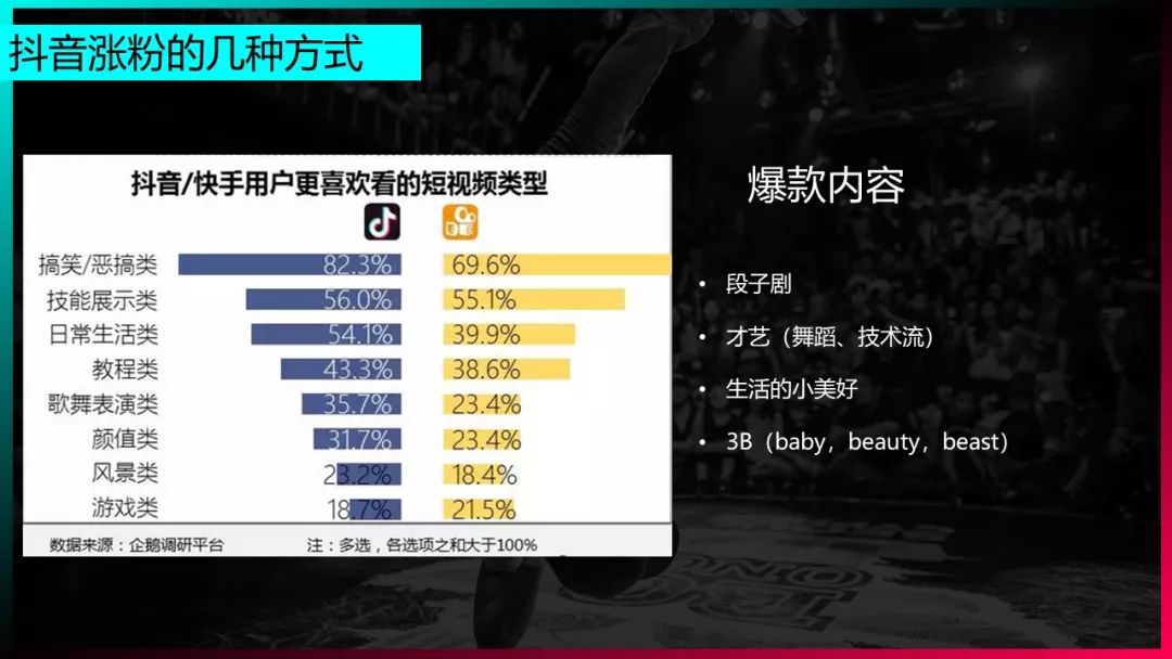 根据这四大类型,段子、才艺,这两个方向的内容出爆款的几率最大。其次是生活小美好,体现生活美好的内容难以持续生产,爆款存在偶然性,但可以朝着这个方向策划内容。最后是3B(baby,beast,beauty),即萌娃,萌宠和颜值,也可能出现一些爆款。