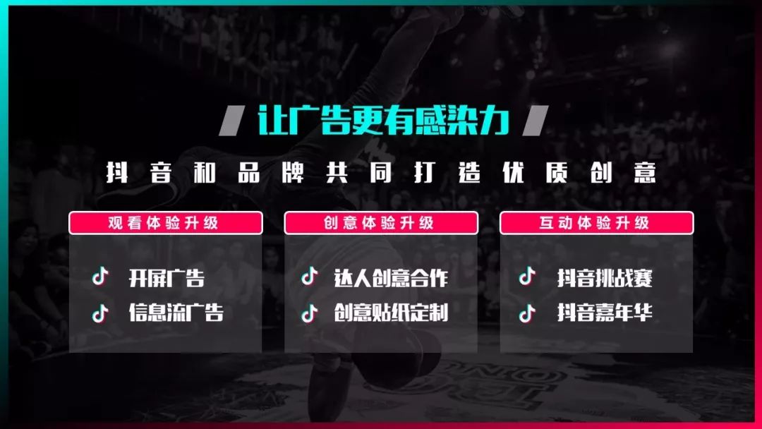 在抖音上营销的方式有六种:开屏广告、信息流广告、达人创意合作、创意贴纸定制、抖音挑战赛和抖音嘉年华。我具体讲一下前两种。