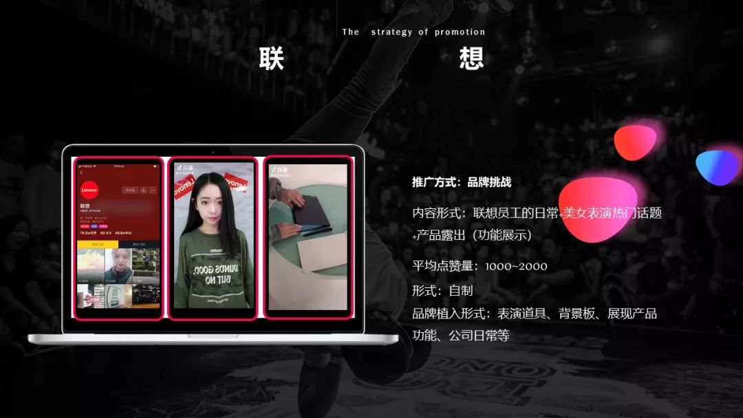 主打颜值,走Fashion路线。沿袭抖音最初的技术(舞蹈)方式,通过一个高颜值的美女以联想的产品为道具,做一些运镜和抖音热门内容的模仿。产出高,下午6点左右定时发布,已发布300多个作品。