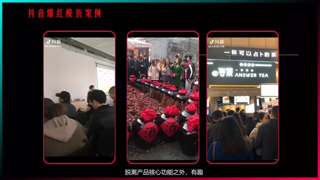 抖音上有一套很成熟的网红产品打造路线,如科大讯飞的翻译软件,西安的摔碗酒,郑州的占卜奶茶都已成为抖音的爆款产品。网红产品在抖音上实现广泛传播,其核心思路是脱离产品的核心功能,产生有趣和意想不到的效果。