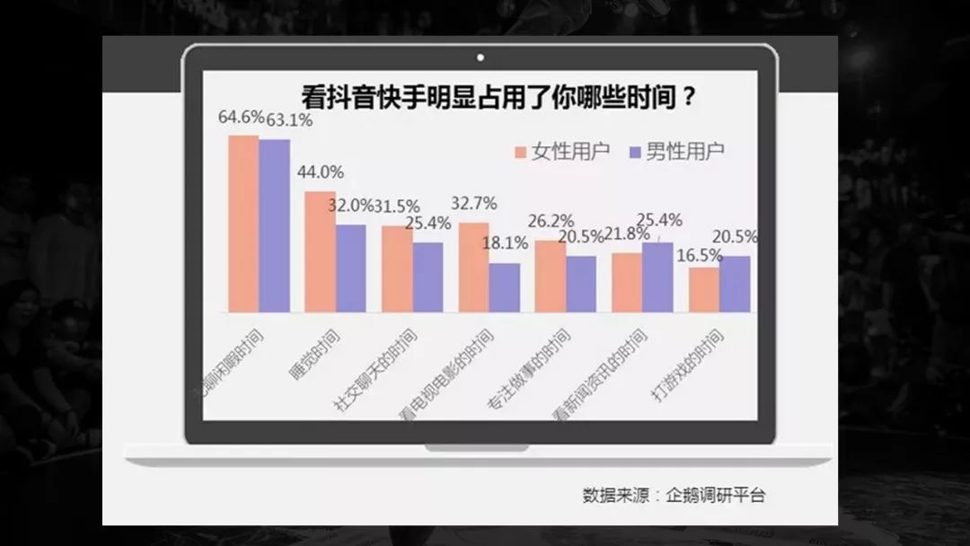 抖音和快手是目前最火的两个短视频APP,两大软件占用了用户很多时间,很多人都表示一刷抖音就是四五个小时。企鹅智酷调查发现两大软件占用用户时间最多的是无聊闲暇时间,其次是睡觉、社交聊天和看电视电影的时间,这是其他平台内容流量下降的原因。