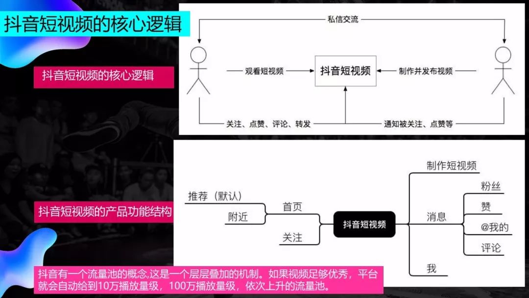 这种产品结构承袭了今日头条本身的算法推荐逻辑,抖音在运营过程中会有一个流量池的概念。一个视频上传后被扔到10w播放量级的流量池里,让这一部分用户先看到,产生转赞评的数量达到一定程度后,视频会被推送到100w播放量级的流量池,依次上升的流量池,让越来越多的用户看到。