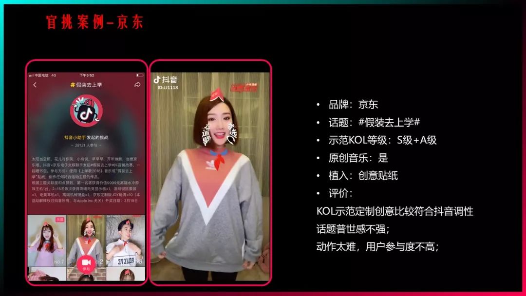 官方挑战和品牌挑战推广资源不同,用户参与的量级自然有差别。官方挑战赛用户量级达到万级以上,品牌挑战赛可能在千人级。除了示范者,发起者,KOL做示范引导外,普通用户发布的视频绝大多数跟品牌不相关,二者在本质上没有什么区别。