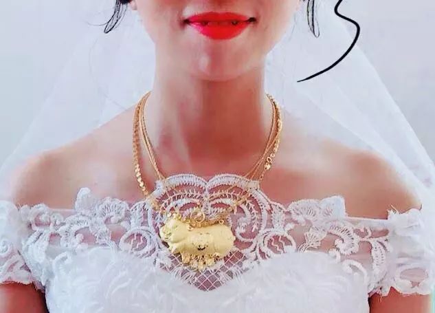 结婚一定要穿金戴银,我去过不少婚礼,新娘不管穿西式白婚纱,还是中式旗袍,左右手加起来要带10支金镯子,脖子上还挂面包那么大的金猪,寓意吉祥。