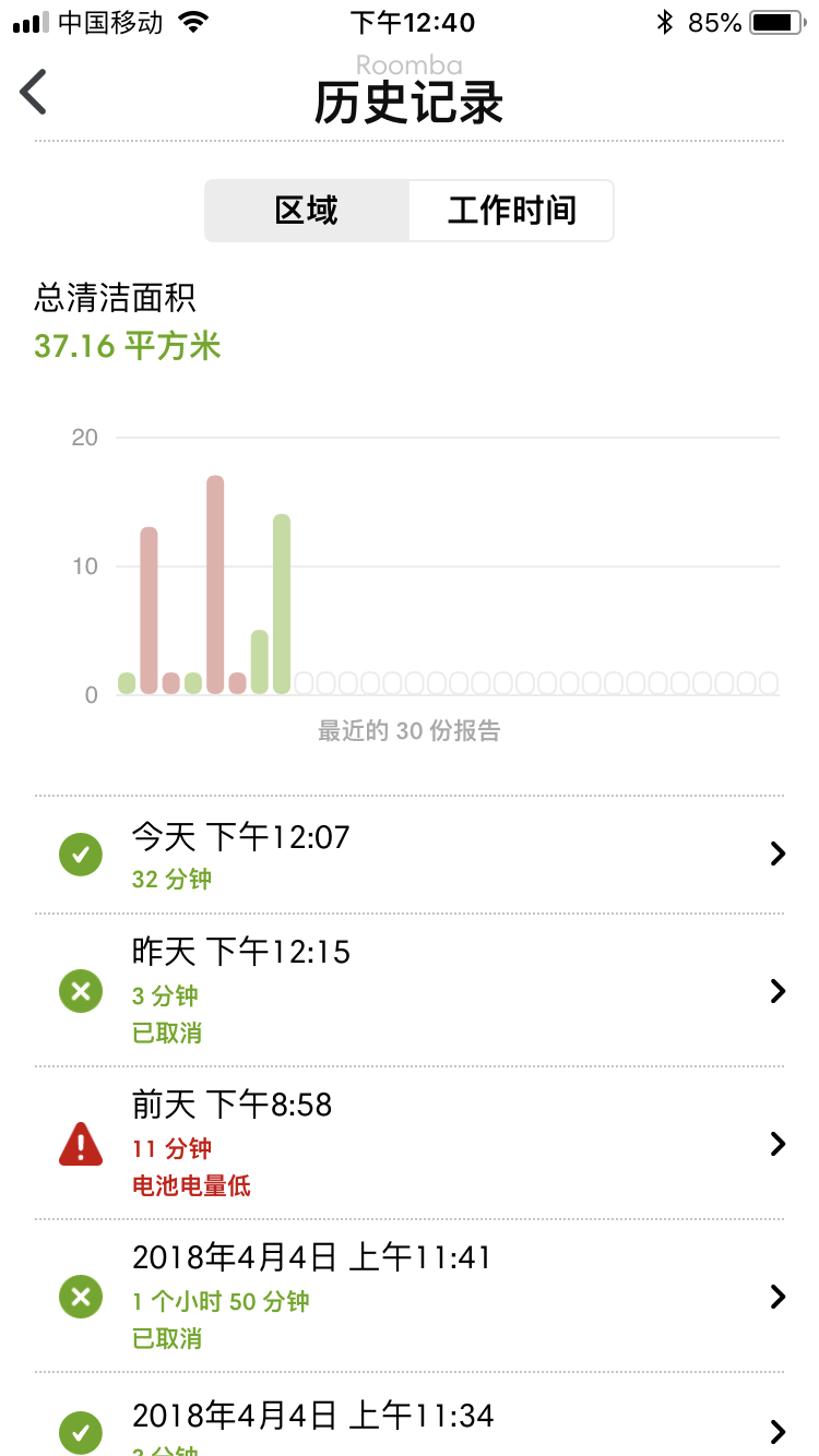 在APP上,除了实时监控扫地情况,还会根据全局规划功能显示工作面积、工作时间、房间清扫地图等信息。