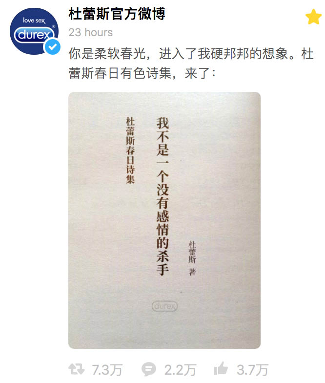 知名正经品牌杜蕾斯趁着春日正好,推出了一本清新可人的有色诗集,题名为《我不是一个没有感情的杀手》。