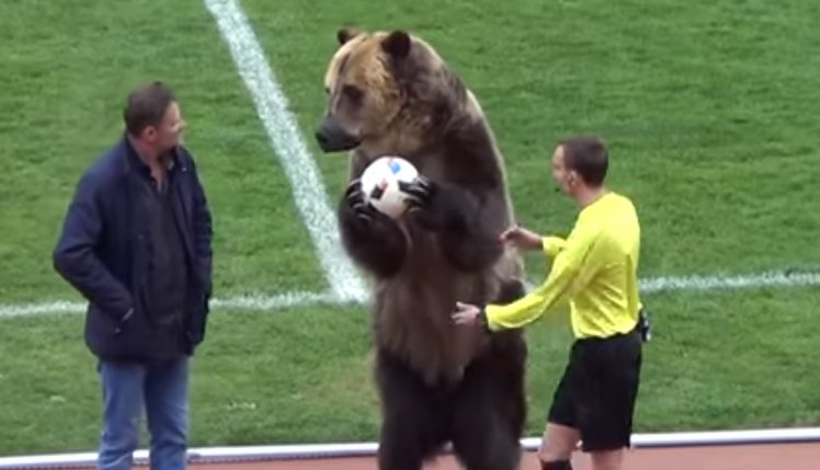 一段俄罗斯丙级联赛视频显示,开场前裁判从一只(比他还高好几个头的)棕熊手里接过了球,随后宣布比赛开始。