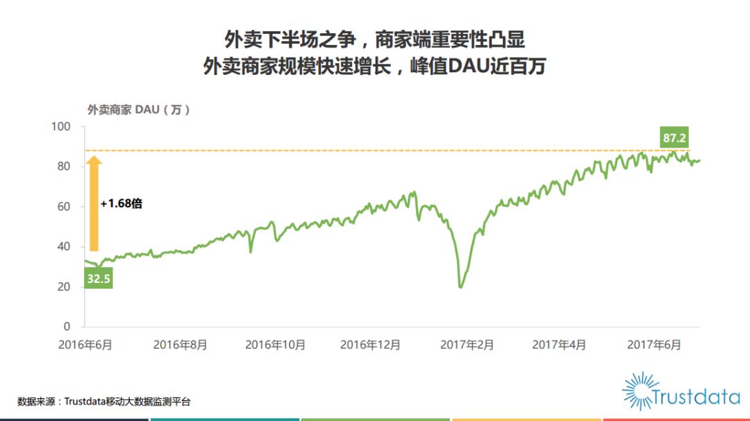 外卖发展距今已经有5、6个年头。数据显示,在线外卖2017年市场规模达到了2046亿,并且还保持着每年超25%的增长率。进入外卖下半场,在用户习惯被充分培养之后,商家成为了外卖增长的焦点。17年6月,外卖商家的数量达到近百万,在2016年至2017年之间,增长率为1.68倍。