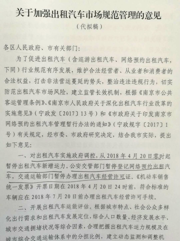 近日,南京市下发《关于加强出租汽车市场规范管理的意见》(代拟稿),对出租车和网约车的数量都做出了限制。