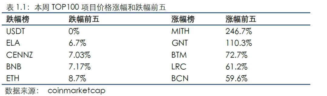 本周区块链资产市值较大幅回升,69个项目市值涨幅超过20%。据coinmarketcap数据,截止2018年4月15日,全球区块链资产市值前100项目总市值为3084.65亿美元,较上周增长23.1%,前100项目的市值均有上涨,其中69个项目市值涨幅超过20%。其中MITH涨幅最高,达246.7%,市值排名上升72位。GNT涨幅第二,市值较上周增长110.3%,排名上升14位至第51名。此外,WAX以及TenX本周进入TOP100,市值较上周分别增长51.5%及44.9%。本周市值排名跌幅最高项目为USDT,排名下降2位至第13名。4月15日,Bitcoin价格为8096.05美元,较上周上涨16.11%,Ethereum价格为511.33美元,较上周上涨31.28%。