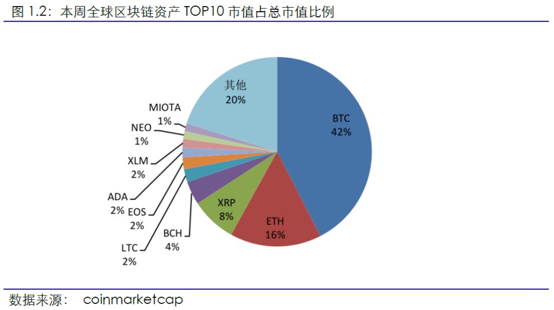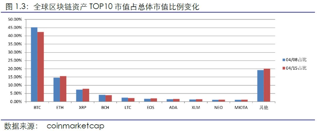 TOP10项目市值分别占整体市值比例变化不大。4月15日,TOP10资产项目市值为2585.77亿美元,较上周略上涨22.2%,占区块链资产总市值比例为79.84%,与上周80.77%相比略有下降。TOP10资产中2项资产市值占比较上周下降,BTC本周市值在数字货币总市值中占比为42.44%,与上周相比减少了2.72%,占比下降最多。