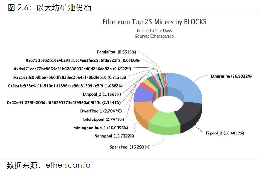 过去一周,以太坊全网出块数据为41705块,环比下降1.33%。其中出块前五的矿池为Ethermine、f2pool_2、SparkPool、Nanopool和miningpoolhub_1,分别出块11220、6842、6378、5727和4187块,占比为26.9%、16.4%、15.29%、13.73%和10.04%。