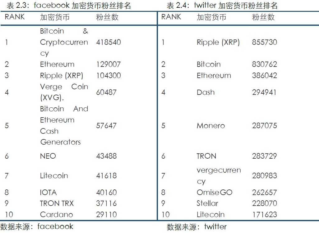 Current为过去一周内telegram新增长粉丝数最多的项目。截止2018年4月 16日中午12点,facebook中Bitcoin &Cryptocurrency、Ethereum和Ripple (XRP)的粉丝数分列前三,分别拥有418540、129007和104300个。Twitter中,粉丝数前三的项目为Ripple (XRP)、Bitcoin和Ethereum,粉丝数为855730、830762和386042个。