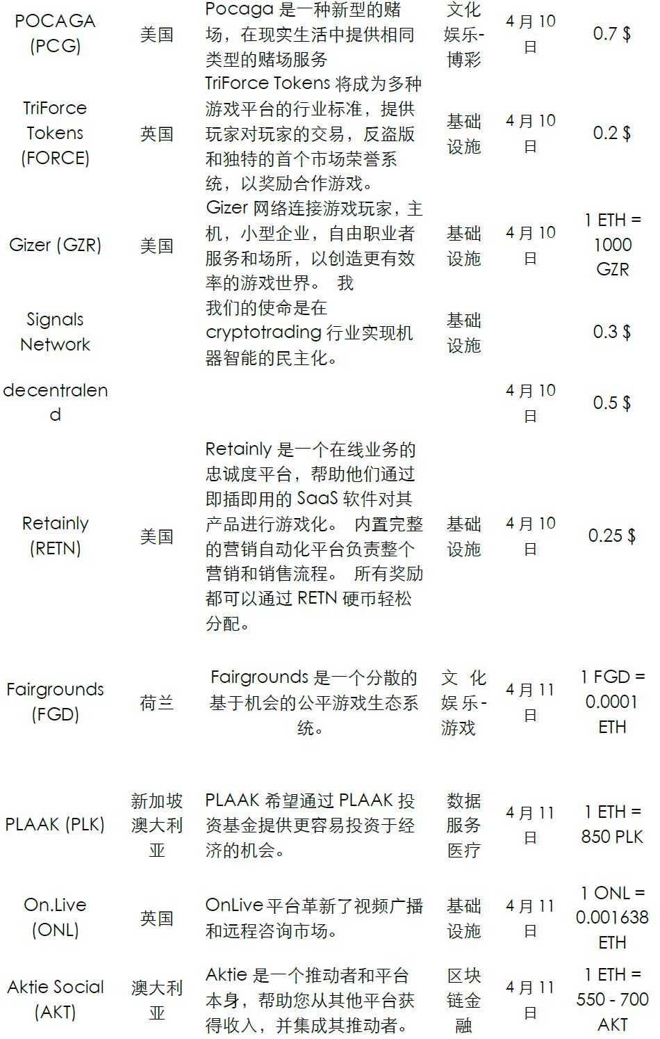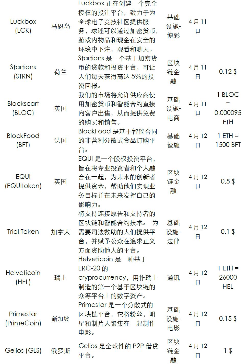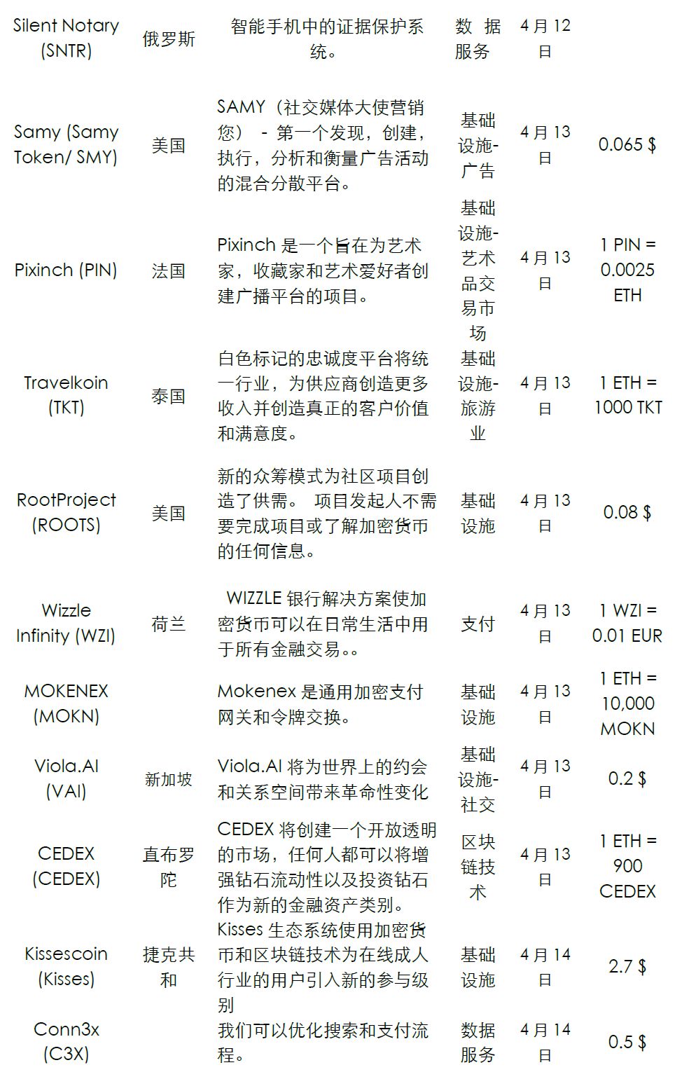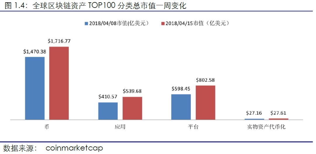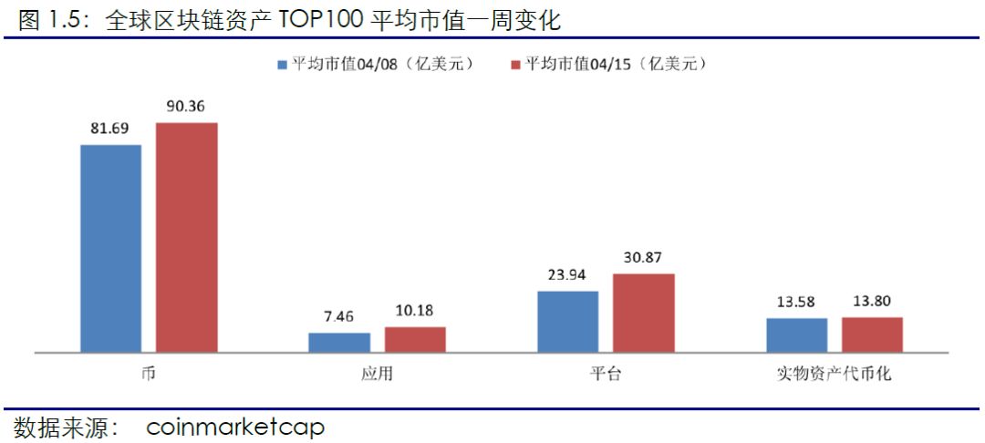 平台类项目总体市值涨幅最大,同时应用类平均市值涨幅最大。2018年4月15日,全球区块链资产TOP100项目中,平台类项目市值较上周上涨34.11%,涨幅最大。本周仅实物资产代币化类项目市值较上周涨幅较小,市值仅上涨1.66%。此外,应用类项目本周平均市值为10.18亿美元,较上周增长36.41%,涨幅最大。平台类项目平均市值较上周略增长28.95%。币类项目平均市值较上周上涨10.61%,跌幅最小。