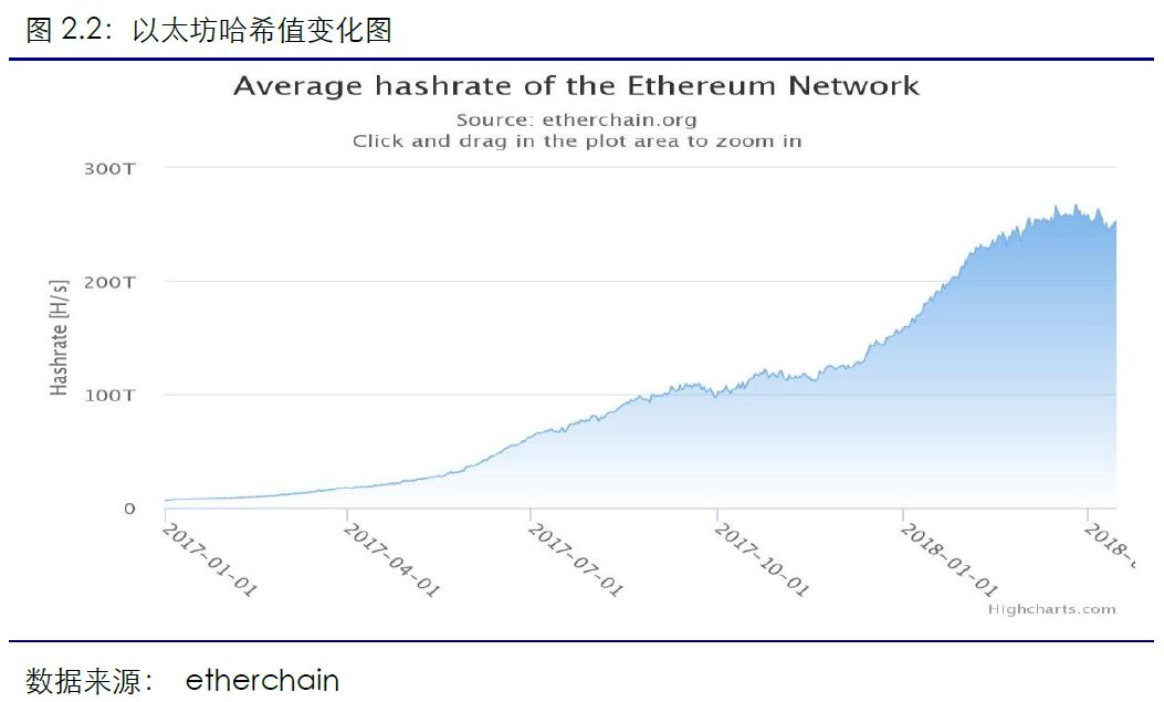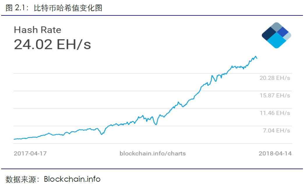本周比特币算力和以太坊算力均稍有下降。2018年4月9日至4月15日,比特币全网哈希值平均值为24.02 EH/s,相比上周环比下降0.415%。