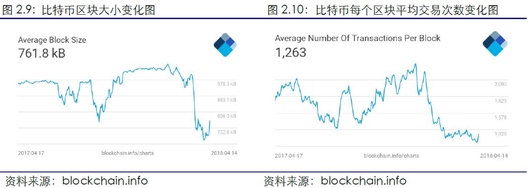本周比特币区块平均交易数上升,以太坊区块平均交易数继续下滑,同时两者区块平均大小均上升。根据blockchain.info数据计算,2018年4月9日至4月15日,比特币本周每个区块的平均交易次数为1263次,与上周环比上升8.23 %。每个区块的平均大小为0.762Mbs,与上周环比上升14.41%。