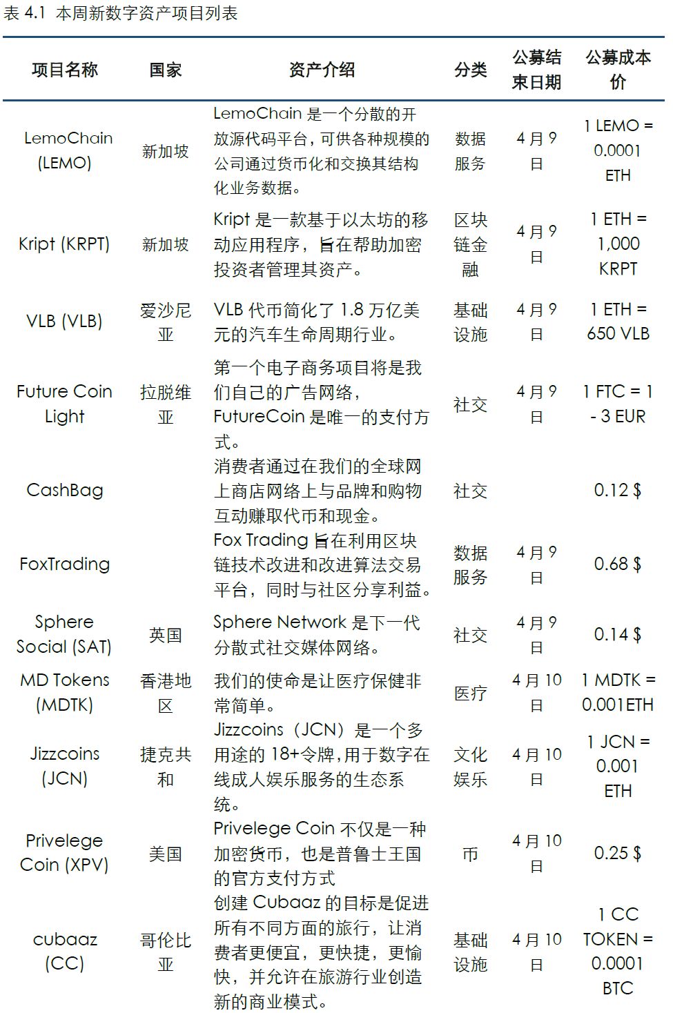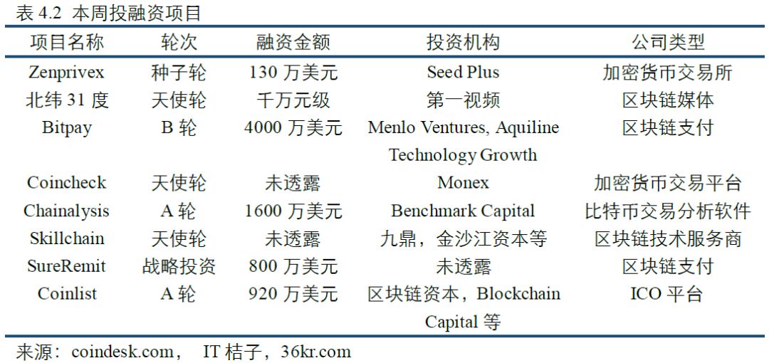 本周完成公募融资的新数字资产项目共有48个。从国家上来看,39个资产项目收集到国家信息,拥有项目数最多的国家为美国,新加坡和英国。其中美国拥有项目数7个,占比17.9%,新加坡和英国各占比12.8%;紧接着荷兰,法国,俄罗斯和捷克共和国各自约占5%,其余13个国家或地区各自仅拥有1个项目,一起均分剩余的33.3%。从项目类型上来看,44个资产项目有明确分类,资产类别最多的为区块链基础设施,包含12个,占比27.3%;其次是区块链金融(15.9%),社交(11.4%),文化娱乐(11.4%)和数据服务(9.1%);其余9种类别平摊剩余的20.5%。总体来看,本周新数字资产项目国家分布集中于美国;资产类型基本为应用型,区块链基础设施是主要应用领域。