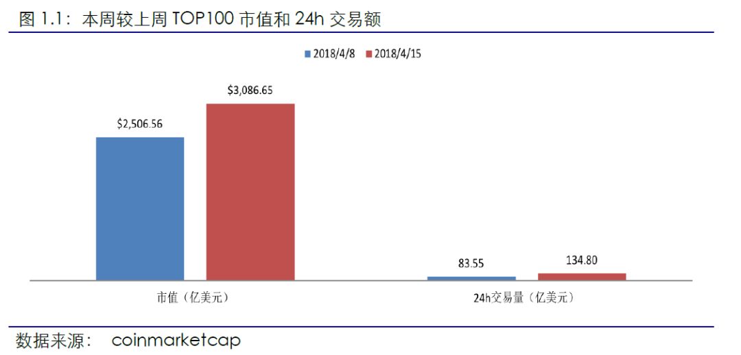 本周区块链资产市值大面积大幅反弹,交易额持续上涨。4月15日,全球区块链资产市值前100项目总市值为3086.65亿美元,较上周增长23.1%。前100项目市值均上升,69个项目涨幅超过20%。24h交易额较上周同期上涨61.3%。WAX和MITH为本周表现较好项目,市值排名分别上升37和72名,均跻身前100。Bitcoin价格为8096.05美元,较上周上涨16.11%,Ethereum价格为511.33美元,较上周上涨31.82%。