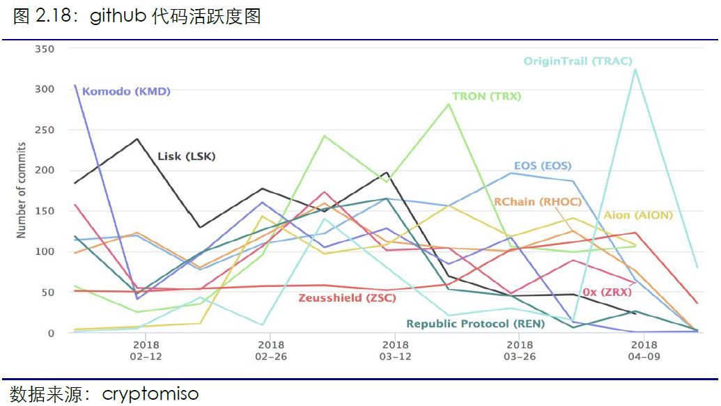OriginalTrail(TRAC)为上周github代码活跃度最高项目。2018年4月9日至4月15日,github代码中TRAC活跃程度最高,达324commits,环比上周上升2060%。Zeusshield(ZSC)活跃度其次,为123commits,环比上升10.81%。其余代码如EOS、AION、TRX等活跃度都有不同幅度的下降。