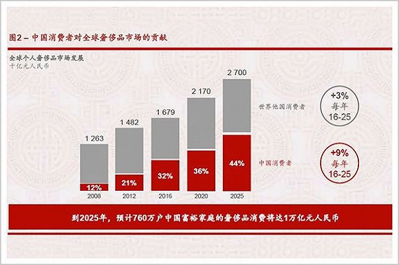 这份报告预测,中国消费者仍将是全球奢侈品市场增长的最大引擎之一,2025年中国富裕人群将买下全球44%的奢侈品市场,也就是1万亿人民币的贡献值。