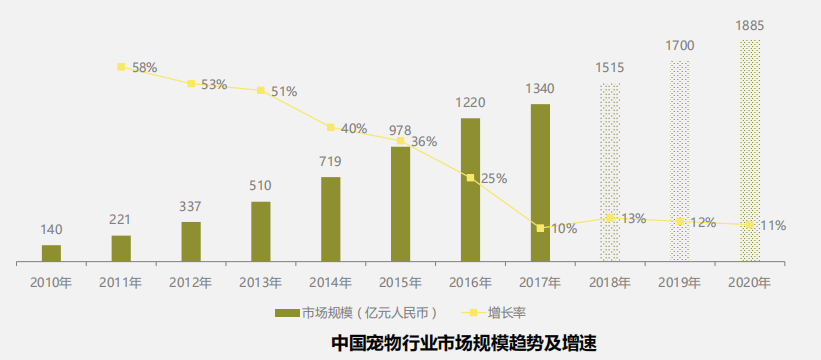中国宠物行业市场规模在已达1340亿元, 到2020年时将达1885亿元